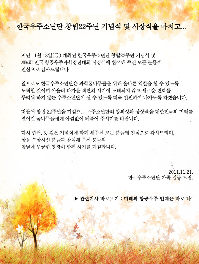 | [감사의 글]창립22주년 기념식을 마치고... | YAK | 2011-11-21 | 2178 |