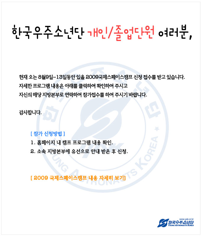 | 196 | [안내] 국제청소년우주인 올림피아드 실시 안내 | YAK | 2009-07-17 | 2803 |