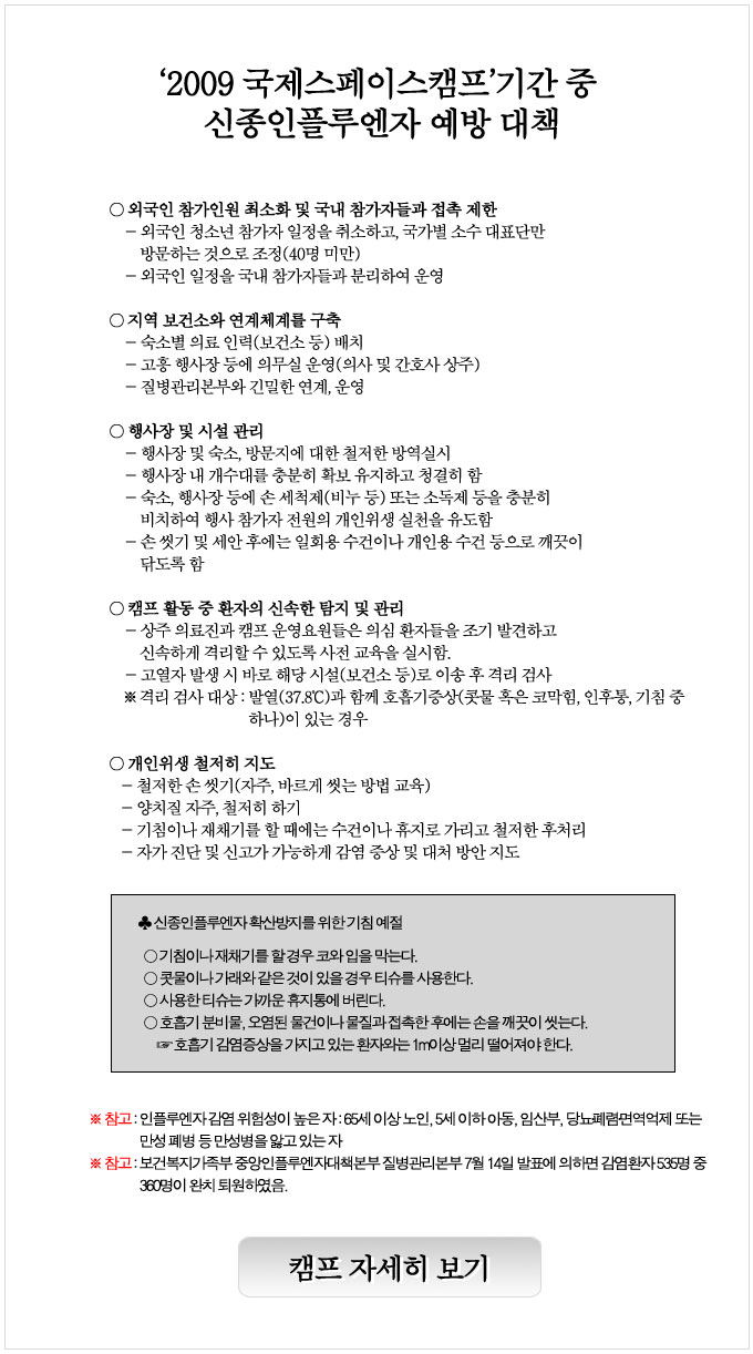| [안내] 2009WSC_신종인플루엔자 예방 대책 | YAK | 2009-07-17 | 2417 |