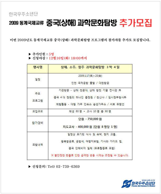 | [안내] 2009 동계국제교류 중국(상해) 추가모집 | YAK | 2008-12-12 | 2649 |