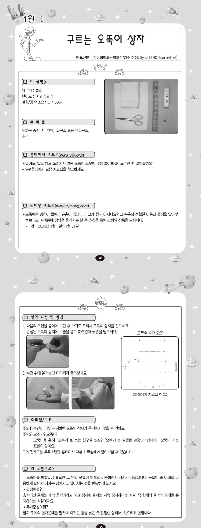 2009년 1월 첫번째 온라인교본은 대전과학고등학교 양명수 선생님의 구르는 오뚝이 상자입니다. 한 번 따라해 볼까요? * 오뚝이 상자 도면은 아래를 참조하세요! ☞ 오뚝이 상자 도면 다운로드 |